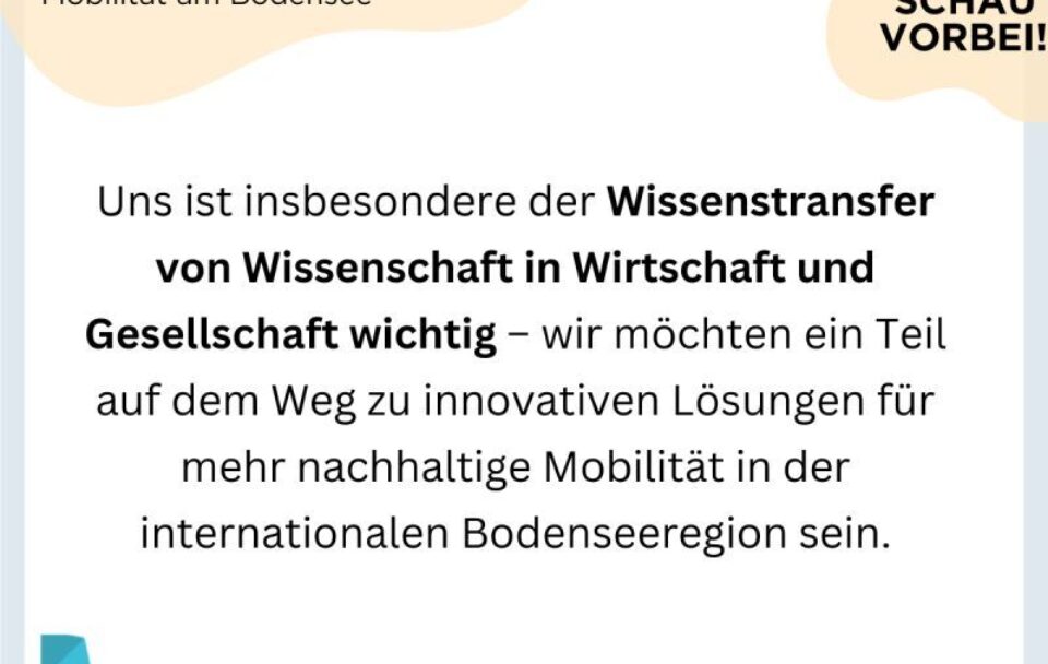 Im Sustainable Mobility Lab ist uns insbesondere der Wissenstransfer von der Wissenschaft in Wirtschaft und Gesellschaft wichtig – wir möchten ein Teil auf dem Weg zu innovativen Lösungen für mehr nachhaltige Mobilität in der internationalen Bodenseeregion sein. Als Transfernetzwerk planen wir spannende Innovation Events rund um die nachhaltige Mobilität mit dem Ziel, dort Akteur:innen aus der Gesellschaft, verschiedenen Branchen und Wissenschaftszweigen zusammenzubringen. 🚘 🚲 🚊 🌱