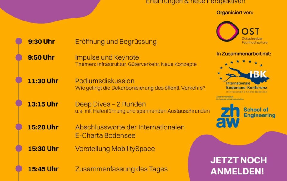 Was Sie erwartet: Ein ganzer Tag voller Impulse, Praxisbeispiele und Austauschmöglichkeiten rund um die nachhaltige Mobilität am und auf dem Wasser und welche Rolle sie in der klimaneutralen Zukunft der Bodenseeregion spielt.