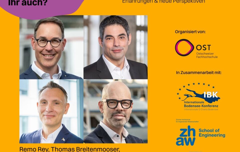 Remo Rey, Thomas Breitenmoser, Christoph Witte und Roman Knecht, die Geschäftsführer / CEOs der Schweizerische Schifffahrtsgesellschaft Untersee und Rhein AG (URh), Schweizerische Bodensee-Schifffahrt AG, Bodensee-Schiffsbetriebe GmbH sowie der Zürichsee-Schifffahrtsgesellschaft werden an der Sustainable Mobility Lab Konferenz 2025 mit Cuno Bieler und Irina Brandenberger über die Chancen und Herausforderungen, welche die emissionsarme Schifffahrt in Zukunft mit sich bringt und was dies für den öV bedeutet, sprechen.